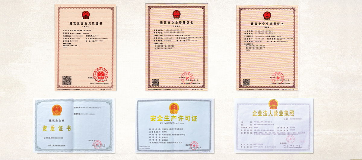 公司擁有“鋼結(jié)構(gòu)制造壹級”和“鋼結(jié)構(gòu)工程專業(yè)承包壹級”專業(yè)資質(zhì),獲得業(yè)內(nèi)認(rèn)可的各類專利及榮譽(yù)資質(zhì)證書;公司及產(chǎn)品已通過了ISO9001質(zhì)量管理體系認(rèn)證和省級檢測、鑒定,安全耐用。